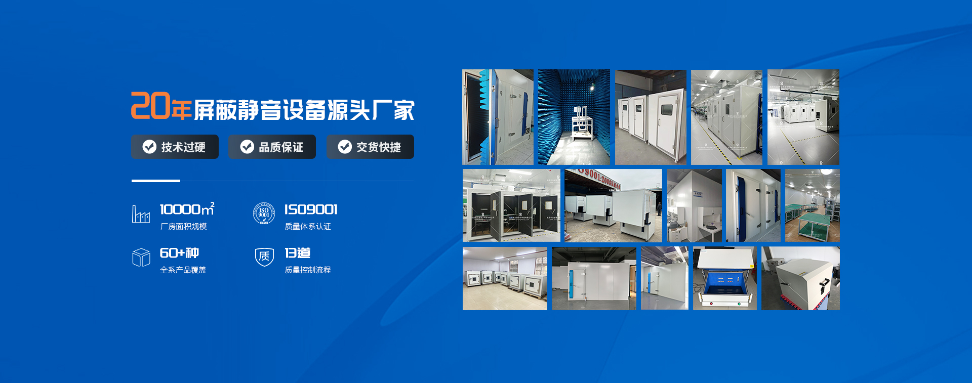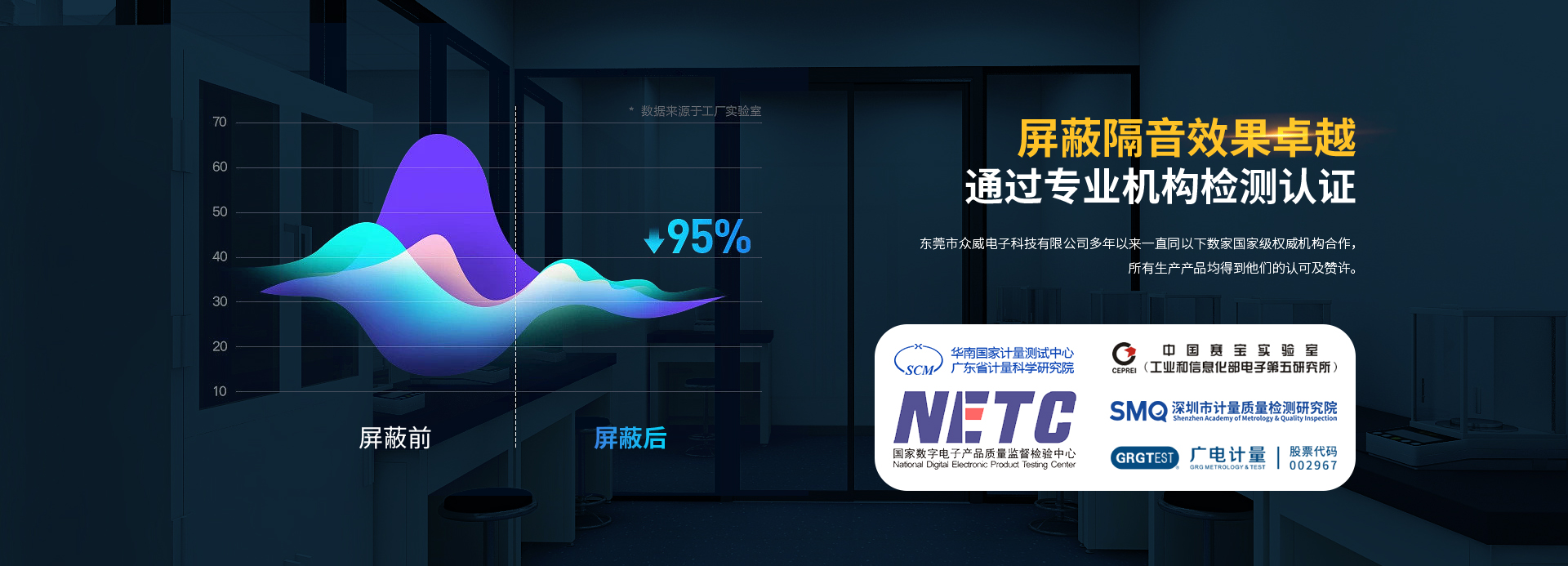 东莞市众威电子科技有限公司成立于2000年,购地自建生产基地,厂房面积10000余平方米,是一家专注屏蔽设备、静音设备、机械设备自主研发制造的大型独资企业;通过众威人不断的高要求创新与高品质服务,赢得广大客户的信赖,树立了良好的信誉口碑,并得到国家权威机构认可...